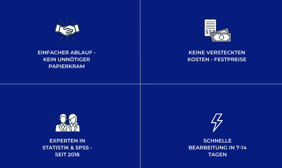 Die Datenauswertungen werden durch erstklassig qualifizierte Fachkräfte mit statistischem Background erstellt: Unsere Experten haben Statistik, Ökonometrie, Empirische Wirtschafts- und Sozialforschung, Wirtschaftswissenschaften, Psychologie oder Mathematik an renommierten deutschen Universitäten studiert. Darüber hinaus greifen unsere Experten auf mehrjährige Erfahrungen im Bereich der statistischen Datenauswertung mit der Software SPSS zurück.