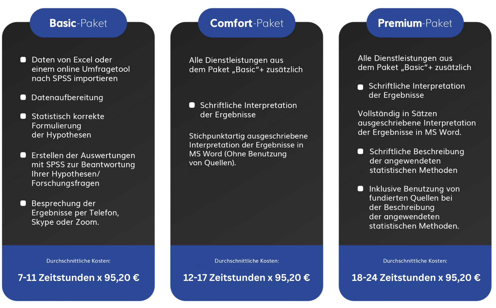 Wenn Sie einen detaillierten Kostenvoranschlag wünschen, senden Sie uns Ihre Unterlagen per E-Mail (info@statisticz.de) zu oder nehmen Sie gerne anderweitig Kontakt mit uns auf. Gut zu wissen: Unsere Angebote sind Festpreisangebote. Sie haben die Möglichkeit die Hälfte der anfallenden Gesamtsumme am Anfang des Projekts und die andere Hälfte bei Projektabschluss zu zahlen (nachdem wir die Ergebnisse gemeinsam besprochen und Sie die Endresultate gesehen haben).